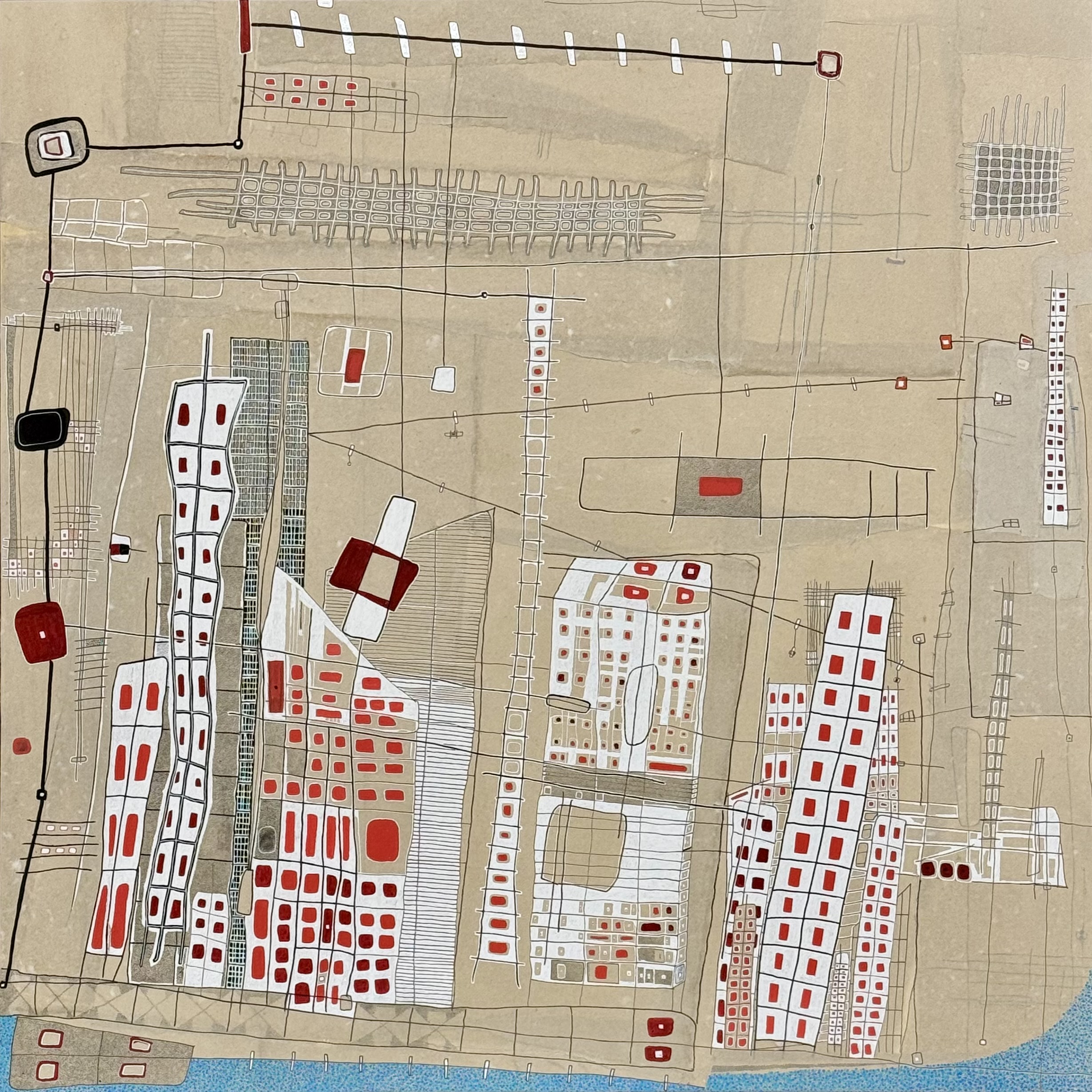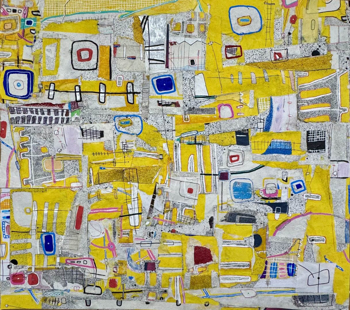 The Sun Sets in the City 2025 22″ x 28″ ink, gel, and paint pens, spray paint, abaca, acrylic, cotton paper, canvas on poster board